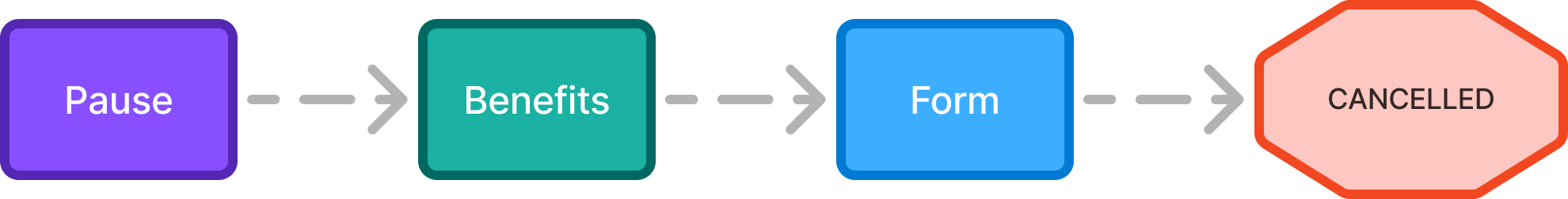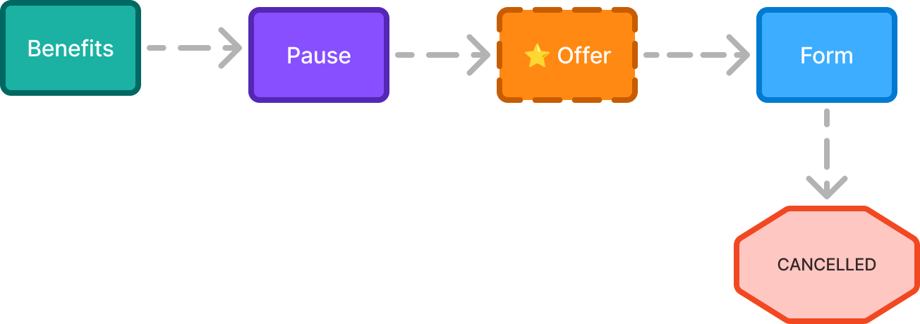 Instead of presenting pause as a modal in the first step of the flow, I moved it to be after the benefits screen. I decided to make pause its own step because it is an important decision that requires the user's full attention.
