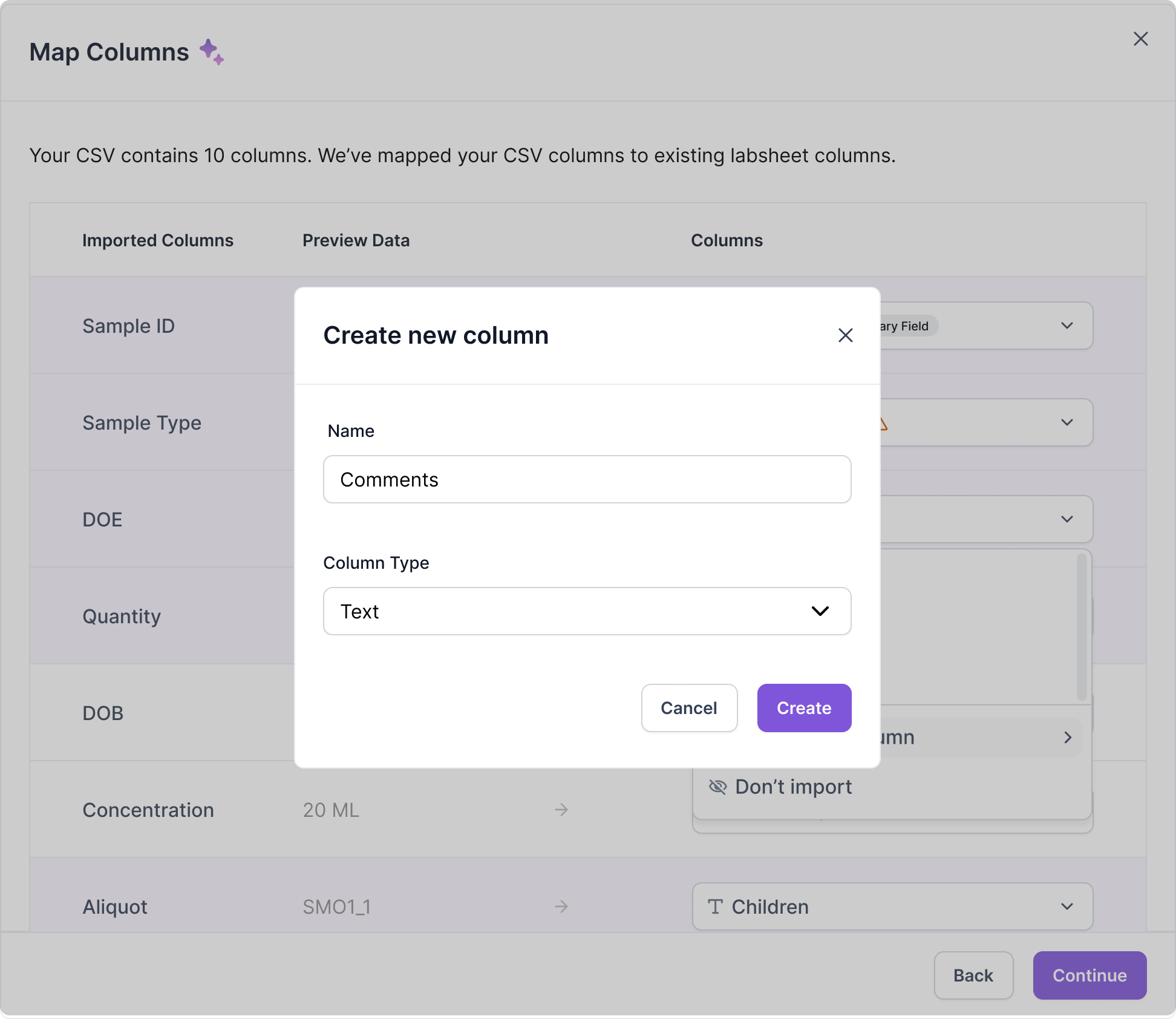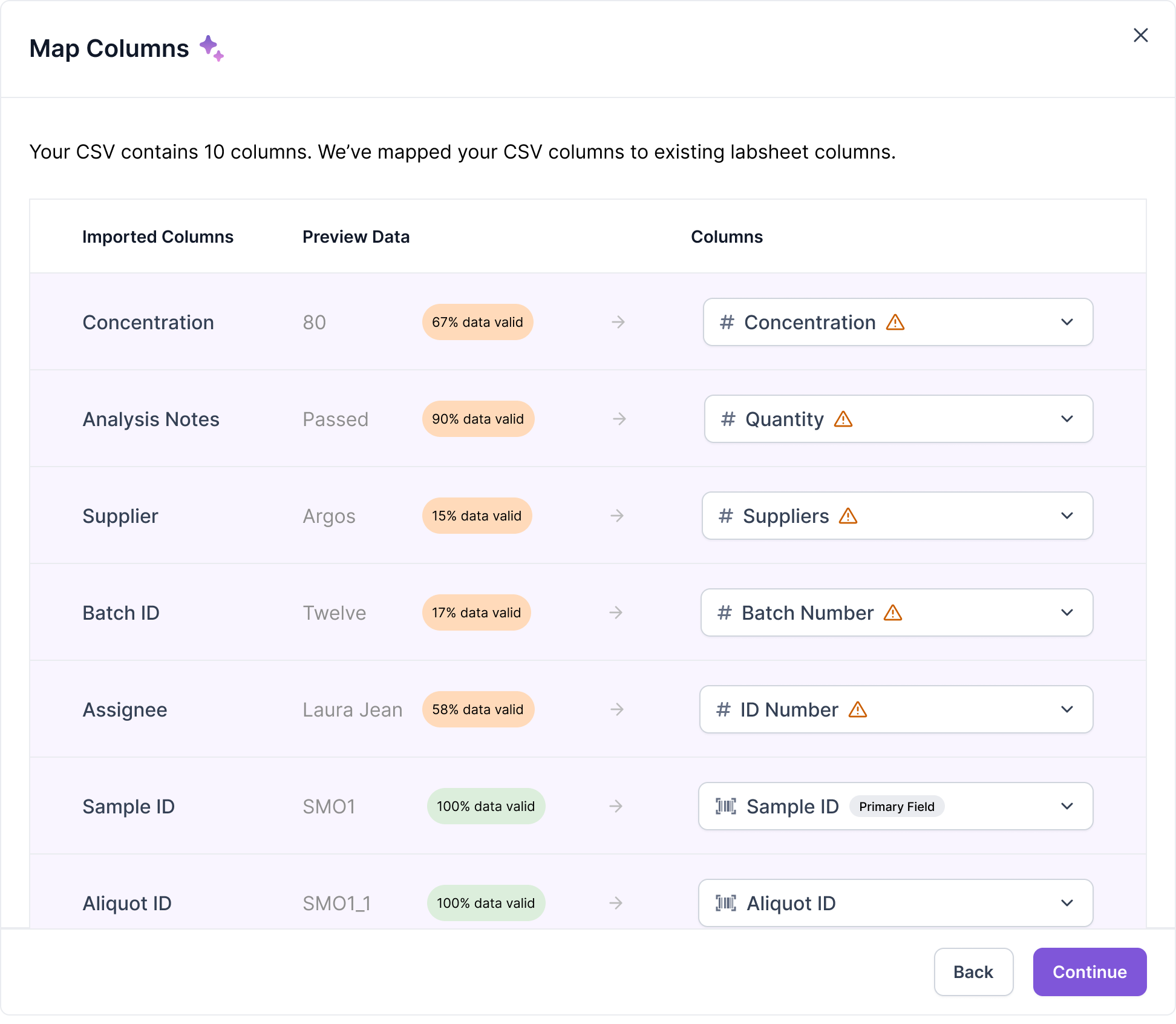 I planned to use AI to automatically map CSV columns to existing labsheet columns based on name and data type similarity. Based on the mapping, scientist can then decide to change the mapping, do not import the column or create a new column.