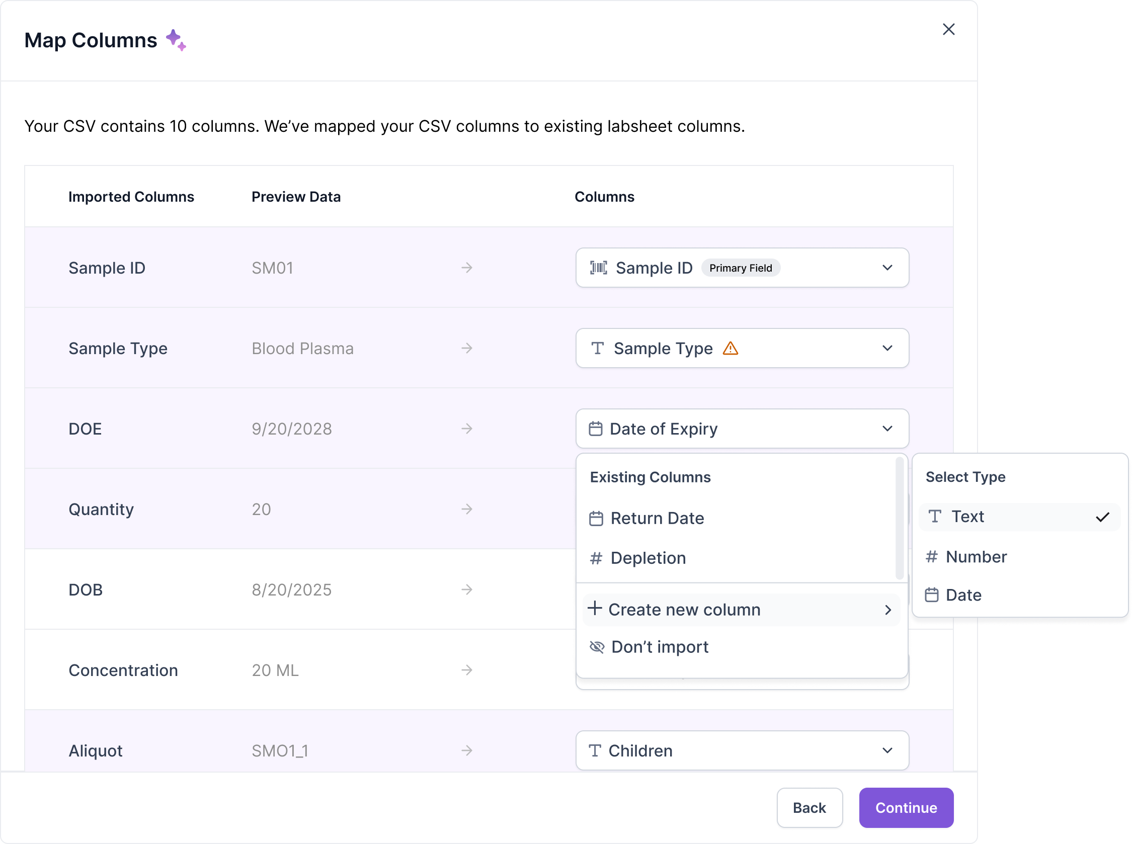Scientists use labsheets to document their sample's information such as species, quantity, expiry date, etc. Each labsheet column has a data type such as text, number, and date.